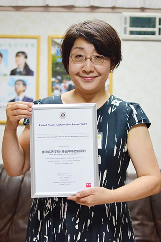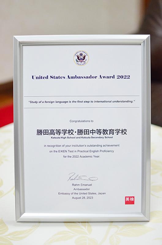勝田高校・勝田中等教育学校は、日本英語検定協会(英検)が年に1度、成績優秀者、優秀団体を表彰する制度で【米国大使賞】を受賞し、ホテルオークラ(東京都港区)での授賞式に参加してまいりました。英検の受験率が最も高かった全国の中高一貫校に贈られる賞で、本校はさらに全国1位ということで受賞した団体の中の代表として、大使館関係者から直接盾を渡されました。今後も世界で活躍するためのリーダーシップや異文化適応能力を育成していきます。